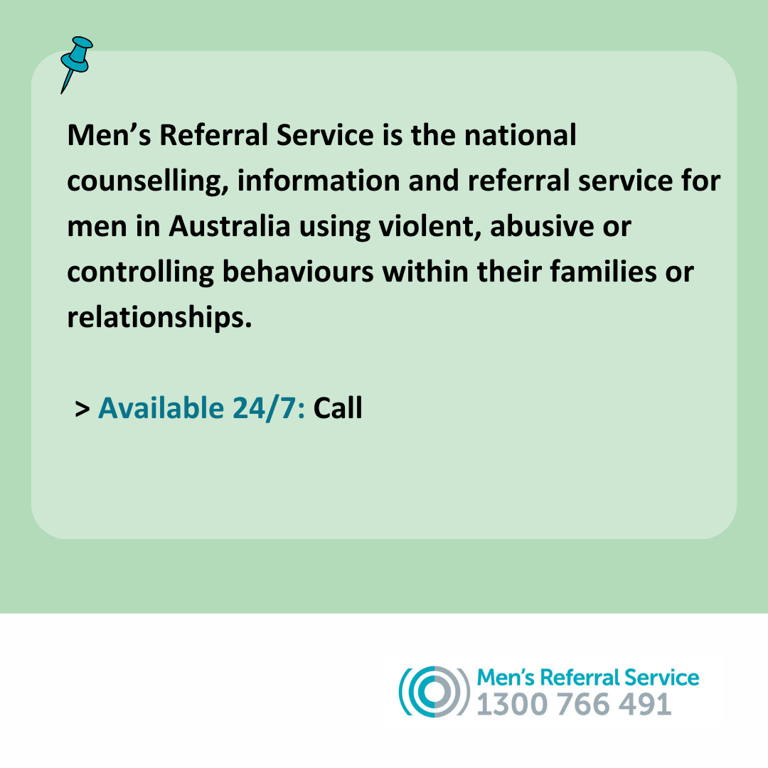 It’s important that people affected by domestic, family and sexual violence have access to the right information, resources and help. It is also important for men using violent, abusive or controlling behaviours in their families or relationships to have access to appropriate support. There are specialist services, like the Men’s Referral Service to help them to change their behaviour.